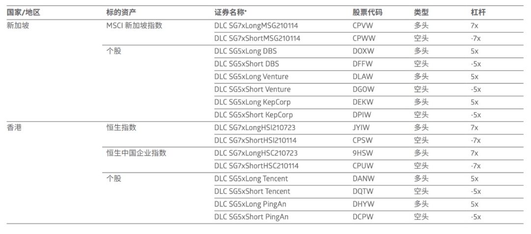 在新交所上市的DLC,跟踪的标的资产集中在香港和新加坡市场。指数方面,有MSCI新加坡指数、恒生指数、恒生中国企业指数。个股方面,有DBS、吉宝、腾讯、平安。详见下图: