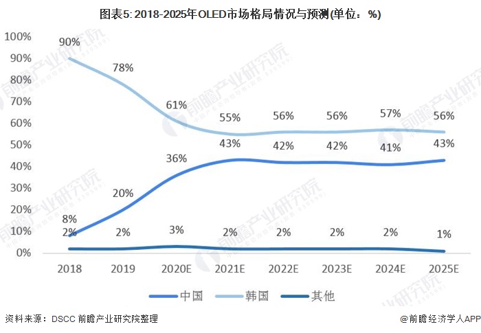 目前国内主要厂商OLED面板生产线总投资超过6000亿元,生产线布局超过20条。预计未来3-5年,国内OLED面板产能将会得到快速的释放。据DSCC预测,到2025年,中国OLED面板市场份额将会快速增长至43%,未来全球OLED面板市场将会由韩国主导的格局变成中韩两国争霸的格局。