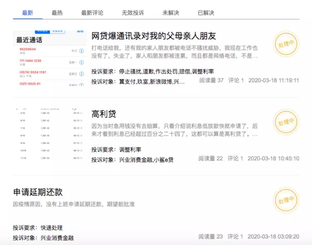 根据聚投诉的投诉信息,兴业消费金融投诉量投诉量371条,解决率77.9%。而最近的一次投诉,就是“网爆通讯录对我的父母亲人朋友”,且显示在“处理中”。