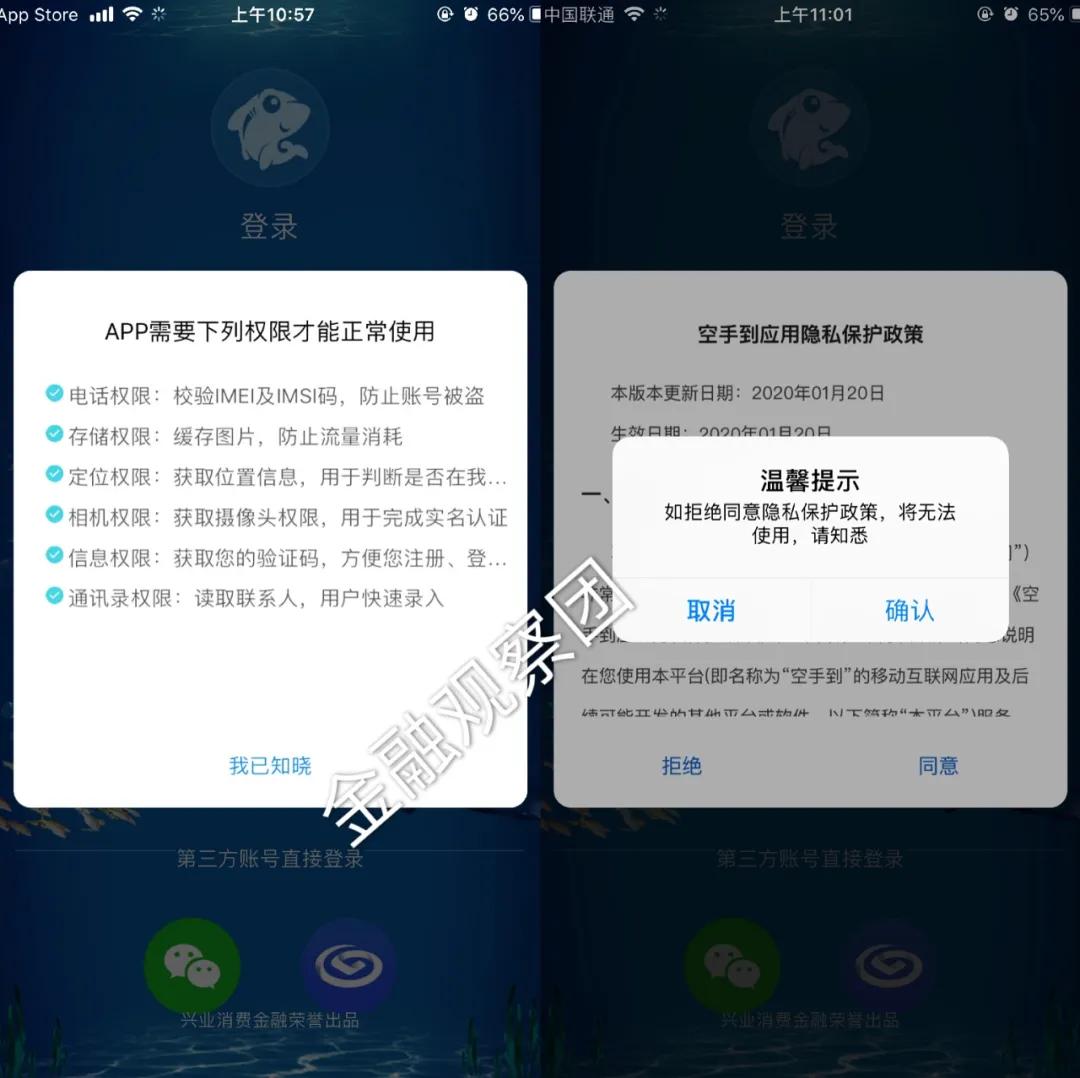 近期,金融观察团将在消费金融领域内开展《消金APP隐私权限调查》系列报道,首先从持牌消费金融机构旗下的IOS版本借贷APP开始,针对不给权限不让用、强制读取通讯录、是否允许销号三项业内主要关注点进行调查,还原行业现状。首期研究的对象,是兴业消费金融旗下的“空手到”APP(IOS)版。