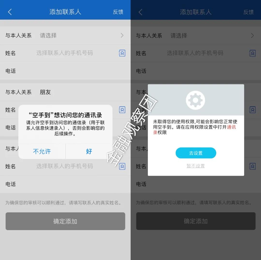 下一步,若要办理贷款,空手到显示要求填写三个联系人信息,包括朋友、同事等。笔者如果选择“暂不设置”通讯录权限,就根本无法填写联系人的手机号码,“请允许到访您的通讯录(用于联系人快速录入),否则会影响您的后续操作”。但实际情况是,空手到只允许“选择联系人的手机号码”,无法手动输入。