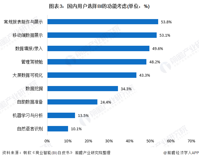 超过半数的企业重视常规报表制作与展示和移动端BI功能