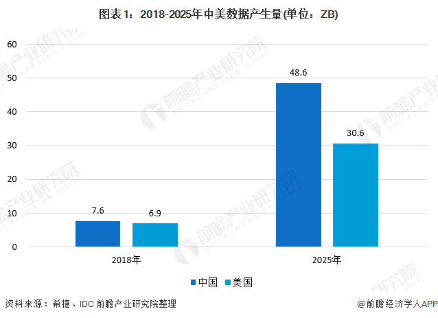 当前,我国正在加速从数据大国向着数据强国迈进。国际数据公司IDC和数据存储公司希捷的一份报告显示,到2025年,随着中国物联网等新技术的持续推进,产生的数据将超过美国。我国产生的数据量将从2018年的约7.6ZB增至2025年的48.6ZB,数据交易迎来战略机遇期。与此同时,美国2018年的数据量约为6.9ZB。到2025年,这个数字预计将达到30.6ZB。