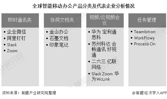 随着移动办公产品功能不断增强,其应用场景也日渐多元化。目前,根据需求场景的不同,市场上移动办公产品可分为即时通讯(IM)、协同文档、任务管理、视频会议及客户管理、合同管理、员工培训等多种类型均需要对应的协同功能。