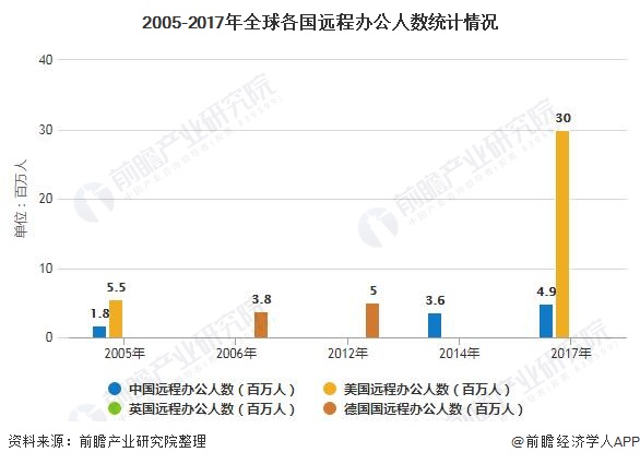其中,美国移动办公的渗透率较高。从远程办公人数来看,2007年美国远程办公人数便达到了3000万人而我国2005年仅有180万名远程办公员工,而到2014年,这一数据上升到360万,2018年据估算也仅490万人,与美国有较大的差距。考虑到中国更大的人口基数,渗透率差距更大,因此中国远程办公市场仍有较大的发展空间。