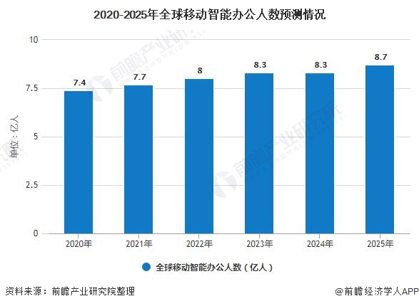 根据2001-2016年移动办公人数复合增速,结合当前全球移动办公人数规模,前瞻预测到2025年,全球移动智能办公用户使用人数将达到8.7亿人,移动办公将成为全球办公的趋势,市场前景较好。
