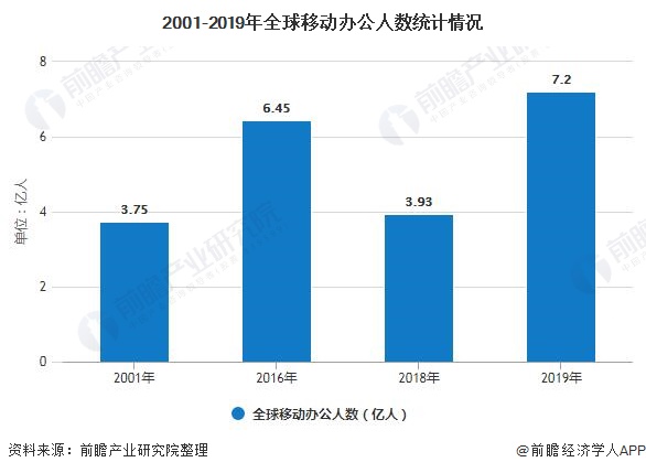 德必集团总裁贾波此前曾公开表示,在2001年的时候,全球的移动办公者的人数是3.75亿,到了2016年全球移动办公者的人数是6.45亿,复合增速为3.68%,2018年全球移动办公的人数接近7亿。未来随着移动办公概念的普及,以及企业对移动办公需求的增长,移动办公人数规模将会越来越大。