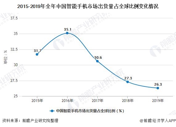 从2015年至2019年,中国智能手机在全球的占比从最高的35.1%(2016年)下滑至最低的26.3%(2019年),从过往占领全球超过三成的出货量降低到了四分之一的水平。