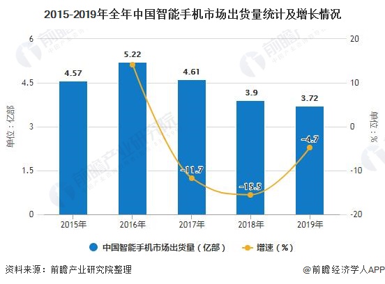 近年来,我国的智能手机出货量也在不断下降。2016年,我国智能手机出货量达到近年的峰值,为5.22亿部,同比增长14.20%。此后,我国智能手机出货量开始下滑,据中国信息通信研究院的数据统计,2019年我国智能手机出货量已下滑至3.72亿部,同比下降4.7%。