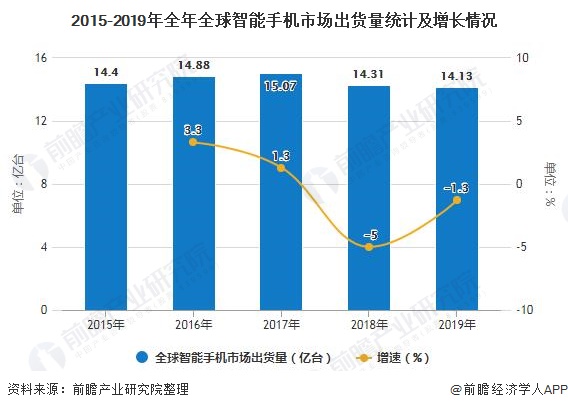 目前,全球智能手机行业正处于行业发展的成熟期。相关数据显示,全球智能手机市场规模正在缩减。2017年,全球智能手机出货量达到近年的峰值,为15.07亿台,同比增长1.3%。此后,全球智能手机出货量开始下滑。根据市场调研公司Strategy Analytics公布的2019年全球智能手机出货量统计数据显示,2019年全球智能手机出货量为14.13亿台,同比下滑1.3%。