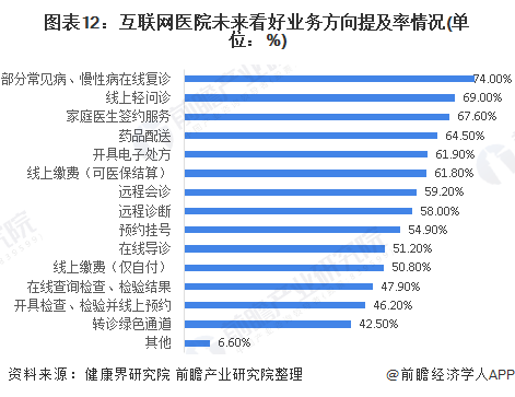 根据健康界研究院调研结果,未来,互联网医院业务开展中,常见病、慢性病在线复诊,线上轻问诊、家庭医生签约服务、药品配送和可医保结算的线上缴费更被看好。其中,常见病、慢性病在线复诊提及率74.0%,是未来互联网诊疗服务的核心业务。