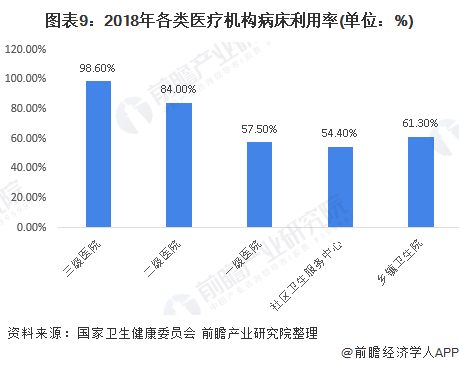 除了服务总量供给不足之外,我国医疗结构也不合理,医疗资源配置不均。目前主要诊疗还集中在公立三级、二级医院。目前国内就诊人次超过40%集中在三级医院,超过50%集中在二级医院,在基层医院就诊比例低于10%。公立三级医院和二级医院的病床利用率分别达到98.6%和84%,而一级医院和社区卫生服务中心等病床利用率仅在58%以下。