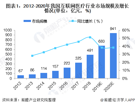 数据显示,2012-2018年,我国互联网医疗行业市场规模迅速发展,从67亿元增长至491亿元,年均复合增长率达到39.37%,反映出我国医疗市场对互联网医疗的迫切需求。按照这一增幅,2020年行业规模将突破940亿元,行业未来将进入规范化发展的高速增长期。