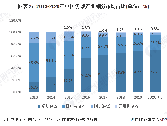根据中国音数协游戏工委的数据,2019年移动游戏市场实际销售收入1581.1亿元,占比68.5%;客户端游戏市场实际收入615.1亿元,占比26.6%;网页游戏市场实际销售收入98.7亿元,占比4.3%;移动游戏收入占据游戏市场主要份额。前瞻预测2020年初的疫情将进一步提高移动游戏市场的占比,预计超过70%。