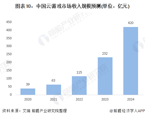 综合上述分析,前瞻总结出随着5G的发展,云游戏的硬件问题得以解决,同时在提高用户游戏体验感的前提下,云游戏将成为现有游戏存量市场的新风口。根据艾瑞咨询数据库的分析,到2024年我国的云游戏市场收入规模将达到420亿元左右。