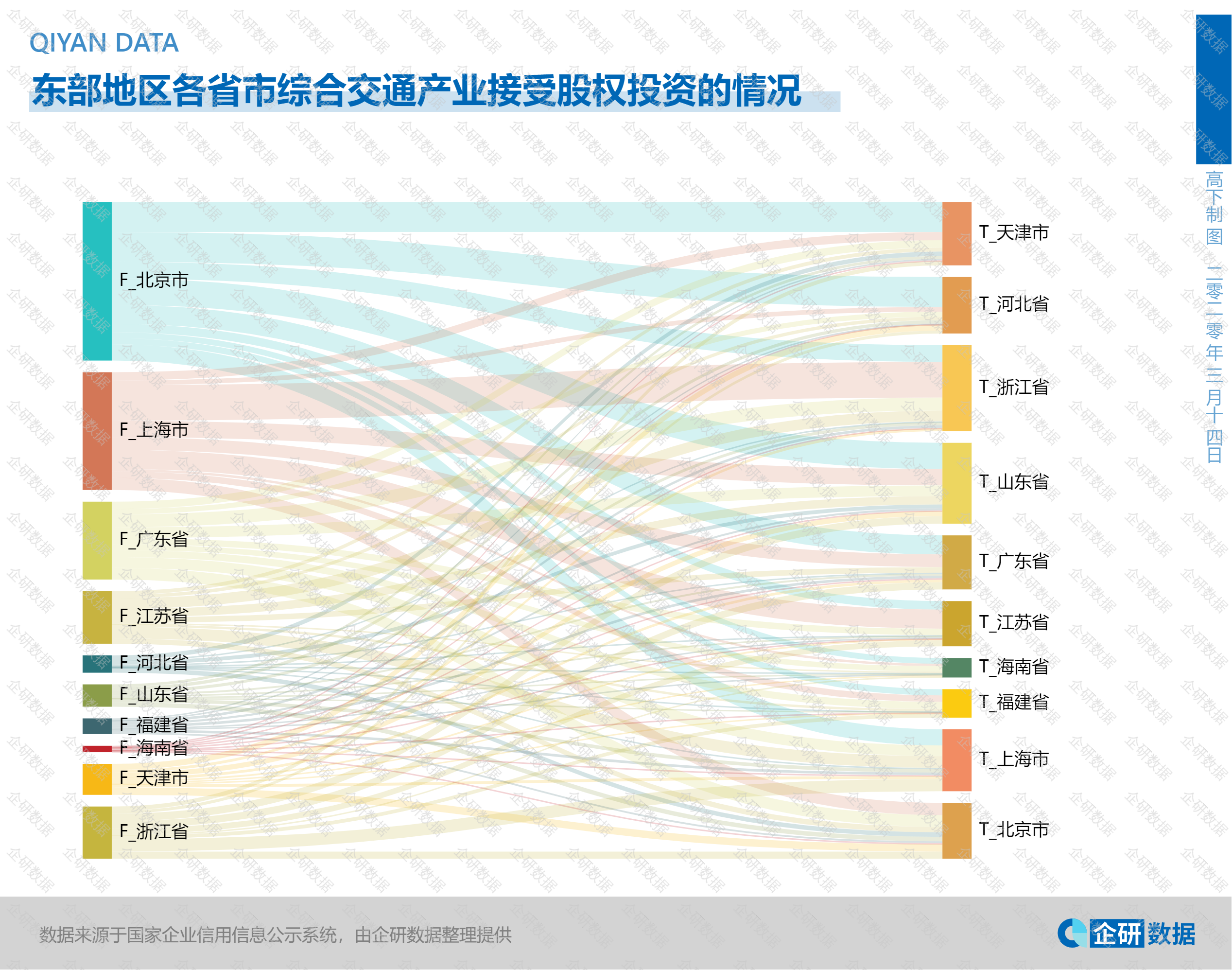 2、从单个省市的视角可以看出不同地区间投资情况的区域性特征,比如浙江省综合交通企业接受外来企业投资最多的为上海市,山东的综合交通企业接受外来投资最多的地区为北京市。