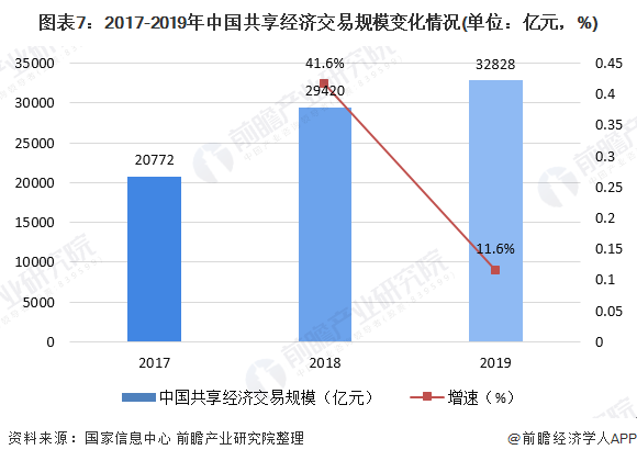 根据国家信息中心公布的初步核算数据显示,由于宏观经济下行压力和互联网人口红利的消减,2019年中国共享经济市场交易规模约为32828亿元,同比增长11.6%,增速与2018年相比下降个百分点。