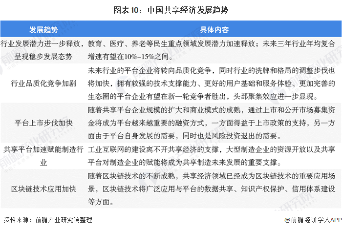 随着共享经济行业发展模式的转变,未来几年共享经济的发展将更加稳健,行业发展趋势如下: