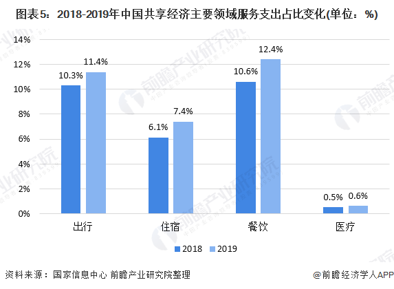 从支出占比来看,2019年,在出行方面共享型服务支出占比为11.4%,比2018年提高了1.1个百分点;住宿方面共享型服务支出占比为7.4%,比2018年提高了1.3个百分点;餐饮方面共享型服务支出占比为12.4%,比2018年提高了1.8个百分点;医疗方面共享型服务支出占比为0.6%,比2018年提高0.1个百分点。
