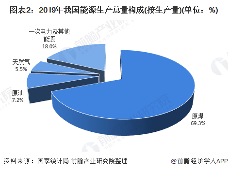 从我国能源生产结构来看,原煤是我国主要生产能源。据国家统计局数据显示,2019年,原煤约占能源生产总量的69.3%;其次为一次电力及其他能源,占能源生产总量的18.0%;原油约占我国能源生产总量的7.2%;天然气产量最少,仅占我国能源生产总量的5.5%。