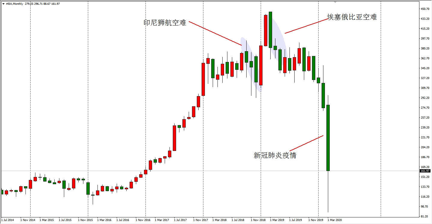2018年10月份,印度尼西亚狮航客机在起飞13分钟后失联,随后坠地爆炸,客机上189人全部遇难,而执飞飞机正式波音的737MAX8机型;2019年3月份,埃塞俄比亚航空客机起飞后6分钟失联,随后坠地爆炸,客机上157人无一生还,执飞飞机同样是波音的737MAX8机型。五个月连续出现两次恶性空难事件,波音无论如何也无法脱掉干洗。伴随着各国禁飞令的发出,波音主力机型737MAX正式宣告停飞整顿。在两次空难的利空消息影响下,波音股价分别出现了13.28%和22.35%的下跌,虽然幅度不小,但完全称不上伤筋动骨。尤其是空难的原因并非完全因为涉及失误,市场情绪较为稳定。