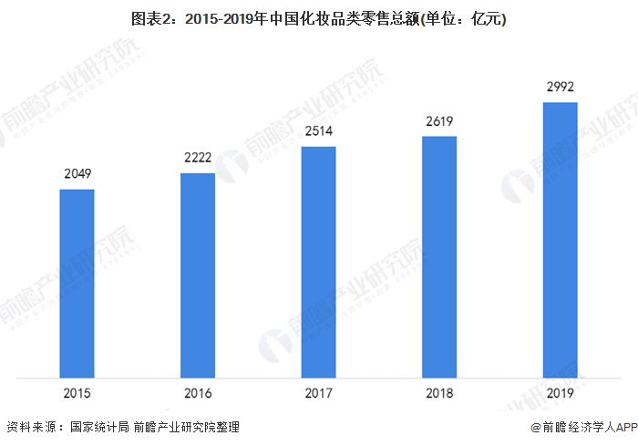 近年来,在“颜值经济”的驱动下,我国化妆品类零售总额持续提高,我国已成为全球化妆品消费第二大国家。据国家统计局数据显示,2019年,我国化妆品类零售总额约为2992亿元,与2015年相比增长超900亿元。
