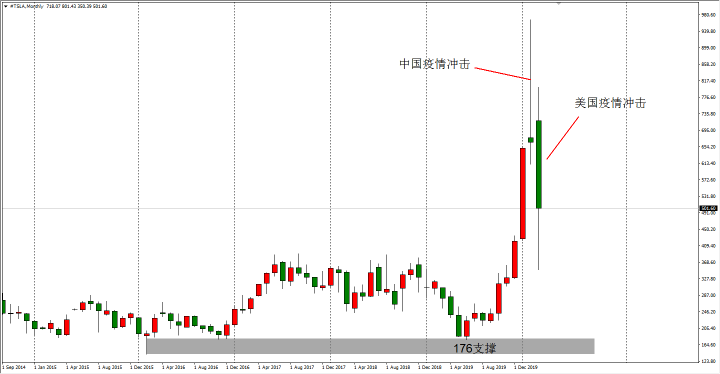 由于特斯拉在2018年10月份在中国建厂,所以在2月份中国疫情最为严重的时期,特斯拉股价也受到利空冲击,全月以长上影线的阴线收盘;进入3月份,虽然国内疫情得到了全面控制,但欧美疫情大爆发,特斯拉去年11月份在德国建厂,欧洲疫情对其形成利空冲击,又因为美国是特斯拉的注册地和大本营,美国疫情的泛滥也让特斯拉股价雪上加霜。整个3月份,特斯拉股价下跌24%,目前尚没有出现有效反弹。