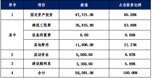 项目总投资估算为56,081.98万元。其中:固定资产投资47,721.98万元;建设期利息3,360.00万元;流动资金5,000.00万元。