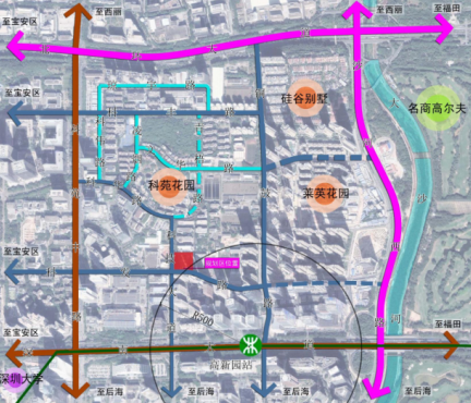 项目位于南山区粤海街道,临近深圳大学,处于大沙河创新走廊高新园区片区内。西邻城市次干道科技大道,南临规划城市次干道科发路(现状为支路),可便捷接入深南大道、沙河西路等城市、区域交通动脉。距前海中心约 5 公里,距宝安国际机场约 15 公里,区域位置良好,对外交通条件便利。