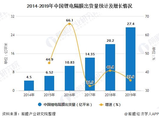 受上述因素的影响,2019年中国锂电隔膜出货量为27.4亿平米,同比增长35.6%,仍然保持快速增长的态势。