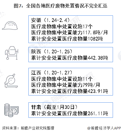 目前,全国由此次疫情产生医疗废弃物产量到底是多少,尚未有官方统计机构进行公布。据前瞻产业研究院不完全统计,目前,安徽地区在1月24日至2月4日累计安全处置医疗废弃物达1082吨;山西在1月20日至1月25日累计安全处置医疗废物量达442.38万吨;江苏1月20日至27日累计安全处置423.91万吨;甘肃截至1月底,安全处理量达261.11万吨。
