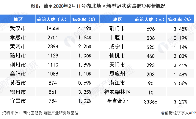 目前,湖北作为此次疫情的起源地,受新型冠状病毒感染肺炎的人数规模庞大,湖北地区承受的医疗压力不堪重负。据湖北省卫健委公布的最新数据显示,2020年2月11日,湖北省新增新冠肺炎病例1638例。截至2020年2月11日24时,湖北省累计报告新冠肺炎病例33366例,其中:武汉市19558例、孝感市2751例、黄冈市2398例、随州市1129例、荆州市1110例、襄阳市1088例、黄石市874例、鄂州市861例、宜昌市784例、荆门市696例、十堰市536例、咸宁市525例、仙桃市460例、天门市293例、恩施州203例、潜江市90例、神农架林区10例。全省累计治愈出院2639例。