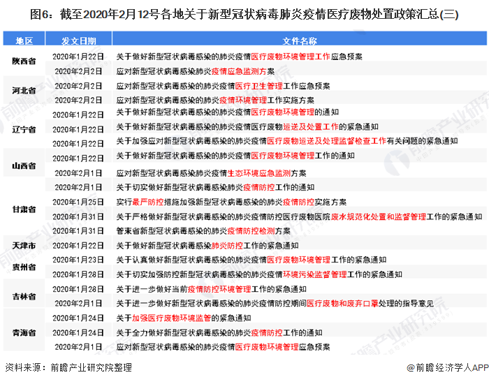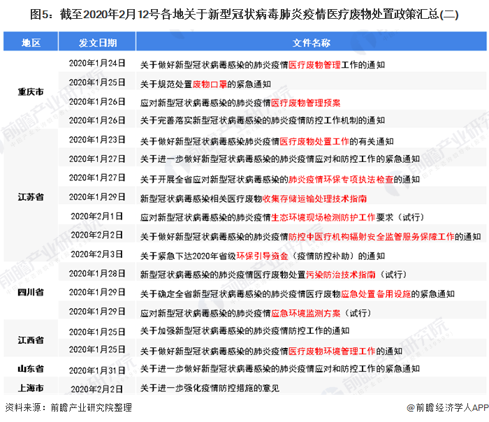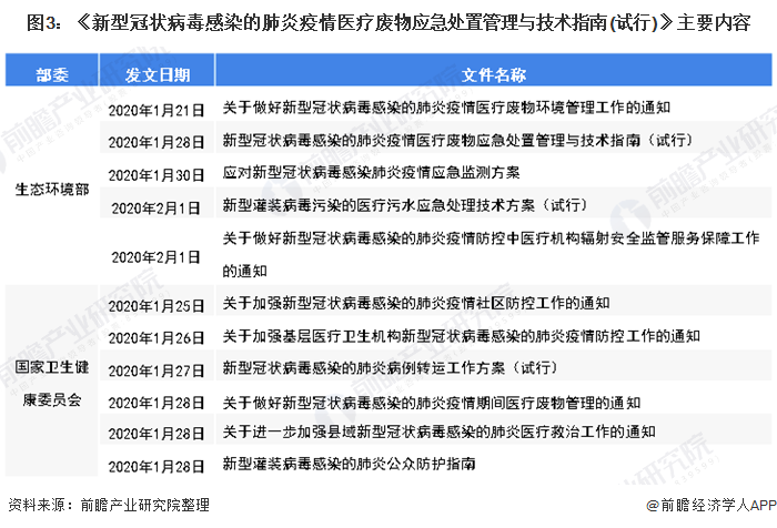 自2019年12月疫情爆发以来,新型冠状病毒感染的肺炎疫情受到中央的高度重视,并围绕疫情在多方面发布了指导文件。其中,医疗废物处置作为疫情防治攻坚战的最后一道防线,备受各方关注。为此,生态环境部、各地环保厅专门召开会议并发文,强力推进疫情防控环保工作,权利支持和督促地方做好医疗废物处理处置工作。据前瞻产业研究院不完全统计,截至目前,生态环境部关于医废处置方面的文件共发布5则,国家卫建委关于医废处置方面的文件共发布6则。