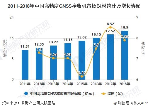 根据上海产业技术研究院,2011-2015年,我国高精度GNSS接收机市场规模保持逐年增长的态势,按照国产高精度接收机销量约占50%的比重测算,2015年,我国高精度北斗接收机规模达到7.51亿元。2018年,我国高精度GNSS接收机市场规模达到18.90亿元,按照国产高精度接收机销量约占50%的比重测算,我国高精度北斗接收机规模达到9.45亿元.