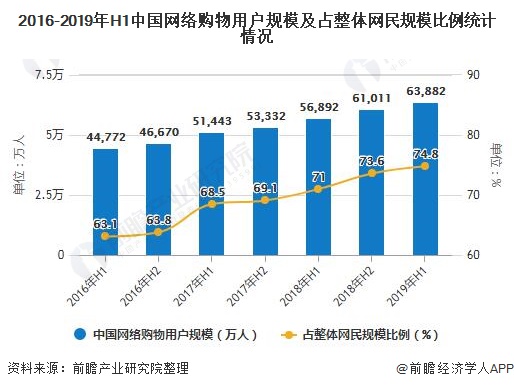 根据CNNIC统计数据,截至2019年6月,我国网络购物用户规模达到6.39亿人,较2018年底增长2871万,占整体网民规模的74.8%;手机网络购物用户达到6.22亿人,较2018年底增长2989万,占整体手机网民的73.4%。