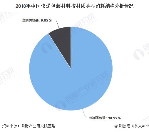 根据全球性环保组织绿色和平发布数据,按照材质类型,快递包装可分为纸质类和塑料类。2018年我国共消耗纸质类快递包装材料856.05万吨,占总快递包装材料的90.95%;塑料类包装材料85.18万吨,占总快递包装材料的9.05%。
