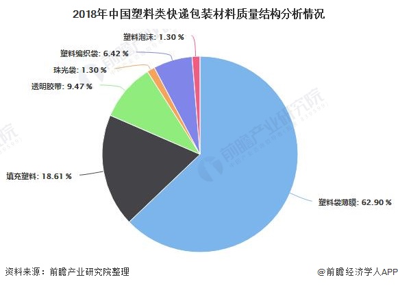 塑料类包装材料主要包括塑料袋薄膜(不包括珠光袋和填充薄膜塑料)、编织袋、泡沫箱、珠光袋、胶带和填充塑料等。其中普通塑料袋薄膜占比最高,质量占比达到62.90%。