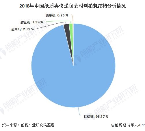 在纸质类包装中,瓦楞纸是消耗量最多的材料。根据绿色和平发布数据,2018年我国快递行业瓦楞纸消耗量达到823.3万吨瓦楞纸,占纸质类包装比例达到96.17%,其他纸质类包装包括运单和文件袋封套以及间接包装材料胶带芯等,合计占比3.83%。