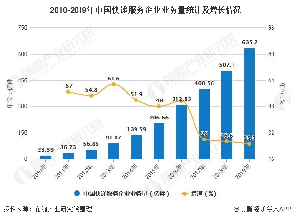 网络购物用户数量的快速增长,带来快递业务量的迅猛增长。根据国家邮政局数据显示,2019年,全国快递服务企业业务量累计完成635.2亿件,同比增长25.3%;业务收入累计完成7497.8亿元,同比增长24.2%。
