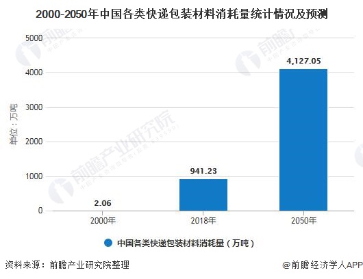 根据全球性环保组织绿色和平发布数据,我国各类快递包装材料消耗量从2000年的2.06万吨增长至2018年的941.23万吨。若不实施有效的措施予以控制,依照当前快递的发展趋势,2025年我国快递包装材料消耗量将达到4127.05万吨,带来巨大的资源负担和环境压力。
