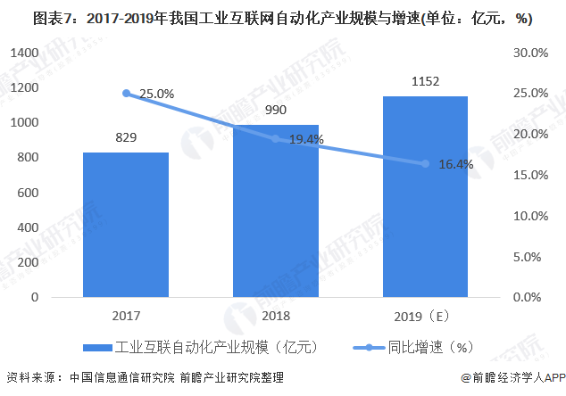 根据工信部数据测算,我国工业互联自动化产业存量规模由2017年的829 亿元增长到2019 年的1152 亿元,年复合增长率达到17.8%,2019 年工业互联自动化产业占工业互联网核心产业增加值比重为21.5%,是支撑工业互联网发展的关键产业之一。