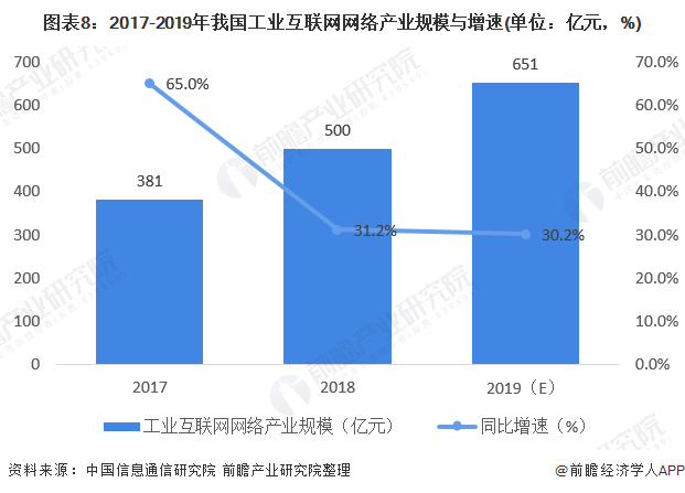 根据工信部数据测算,我国工业互联网网络产业存量规模由2017年的381 亿元增长到2019 年的651 亿元,年复合增长率高达30.7%,2019 年在工业互联网核心产业规模中占比为12.1%。