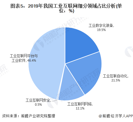 我国的工业互联网主要分为五个细分领域,分别是工业数字化装备、工业互联自动化、工业互联网网络、工业互联网安全、工业互联网平台与工业软件。其中工业互联网平台与工业软件和工业互联自动化占主要市场,分布占比46.4%和21.5%。