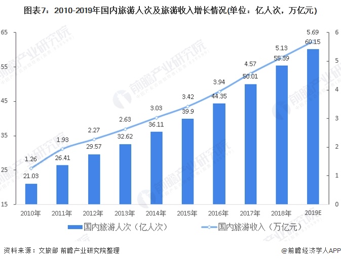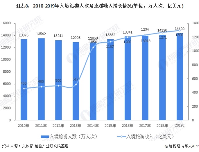 2019年上半年,国内旅游实现收入2.78万亿元,同比增长13.5%,预计全年达到5.69万亿元;入境旅游收入649亿美元,同比增长5%,预计全年达1300亿美元。2019年前三季度国内旅游人数达到45.97亿人次,同比增长8.8%,预计全年达到5.69万亿元;入境旅游人数10876万人次,同比增长4.7%,预计全年达14400万人次。