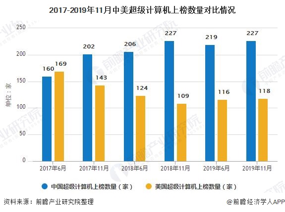 中美两国在超算领域你追我赶的态势已持续数年。据榜单显示,2017-2019年,中国上榜的超算数量整体呈快速增长趋势,从17年6月的160台增加到227台。而美国安装的超算数量则由17年6月的169台连续下降至118台。中国上榜超算数量由2017年12月正式反超美国,直至2019年11月两国差距更加明显,美国上榜超算数量仅为中国的52%。