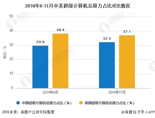 上榜超算数量快速增长是中国最大的优势,但在总运算能力上,美国超算的平均运算能力依旧强于中国。从总算力占比上看,美国超算占比为37.1%,中国超算占比为32.3%;而在六个月前2019年6月的榜单上,美国超算占比为38.4%,中国超算占比为29.9%,性能差距有所缩小。