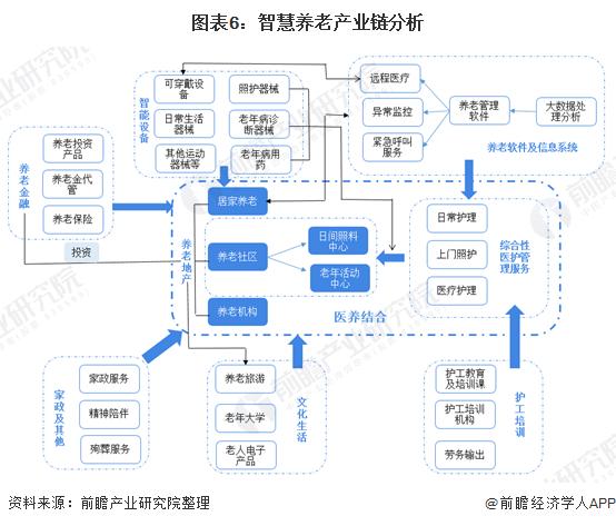 根据前瞻分析,智能养老的服务链上游有智能设备、养老平台、护工培训、养老金融、家政服务、文化生活等,其中智能设备和养老平台是最大区别于传统养老的部分。