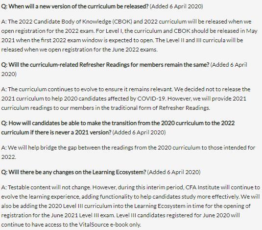 高顿君在CFA协会官网发现,在2020年6月CFA考试延期通知的常见问题中,CFA协会新增了几项内容,其中2021年CFA考纲内容,让我惊了!2021年CFA考纲无变化!