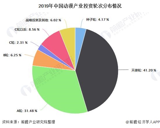 2015年以来,随着二次元用户的崛起以及大量盗版作品的下架,动漫产业公司受到资本的关注,2016年我国动漫产业的投融资达到了历史的高峰;2017年因受到ACG联盟资金链断裂和布丁动画停止运营等负面消息的影响,我国动漫产业进入了一个短暂的调整期。随着负面出清,2018年我国动漫产业市场动能恢复,但资本流向更倾向于具有潜力的项目和更具竞争力的企业,但仍以天使轮融资为主,2010-2019年天使轮融资占比达到41%。