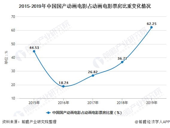 从2015年《西游记之大圣归来》9.56亿元的票房,再到2019年《哪吒之魔童降世》将国产动画电影票房拉升到50亿元,这无一不打开我国国产动画电影的新篇章,2019年国产动画电影占动画电影票房达到62.25%。以我国神话故事和运用国人耳熟能详的人物情景作为动画电影创造的源泉,群众对国产动画电影文化认同感拉满,国产动画电影未来发展潜力巨大。